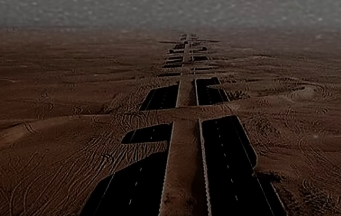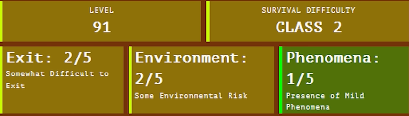 Level 91. It's risky because of it's desertic environmenent and because how difficult it is to find the exit. It's been gven a class 2 in difficulty. Because this level looks like true life locations, some people are tricked into believing that this is the frontrooms. There are mesa, butes plateaux, cannons, meteor craters, roads, mountain ranges over a top of a desert landscape that goes on. The mountains are taller and the canyons deeper than you would expect. The majority of the ground is made of sand. Less of it is made of dirt and sometimes clay. If you dig it's possible to find skeletons. When you find a frewater, take advantage of it because you don't know when the next one will be. There is a small chance that phenomenon might occur to you. like phenomenon X, vision impairment occuring on this level. Find a dark and shaded enclosed preferably indoor place to calm you down. Phenomenon Y is carbon coping, who occurs randomly when wanderers get too deep into this level. What you see might duplicate itself into 2 different sections. After a few days the phenomenon will wear off but you will be all alone. No entities here but the fossils indicate that there were some kind of life before. To enter this level you will have to noclip into the ceiling of level 3 38.1 or find a lone stop sign on level 35 and then interact with it. To exit you have to wander through a random sand dune field which might transition you to level 671. You might also follow highway signs to different levels.