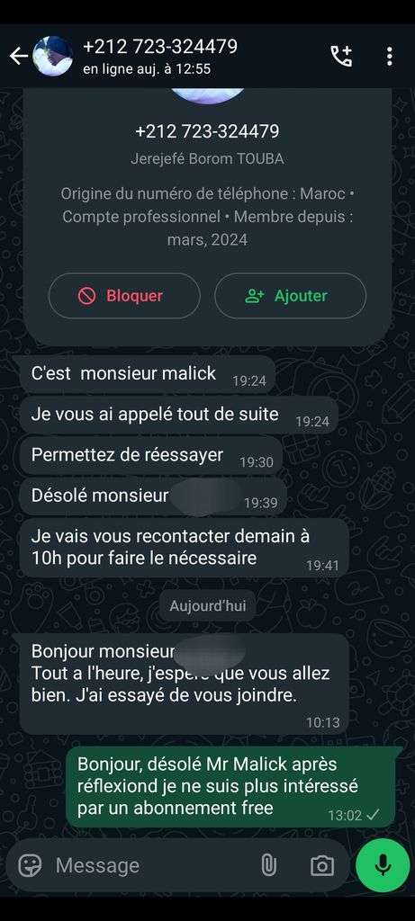 Bonjour c'est monsieur Malick, je me suis inscrit sur Onche pour te proposer a nouveau l'abonnement Free
