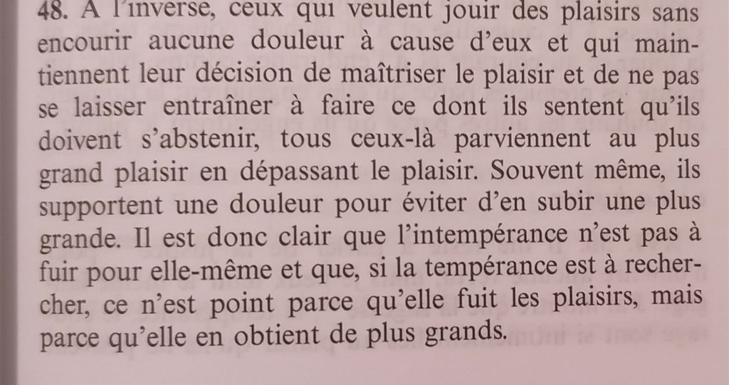 Mais quand tu vantes la douleur, là je pense que tu tombes dans l'écueil classique : Epicure dit que toute douleur est mauvaise, mais nous parlons toujours de fins, si la douleur que tu mentionnes offre un plaisir plus grand en retour, c'est totalement épicurocompatible. Ici j'ai du mal à lui donner tort, dans quelle situation un homme sain d'esprit se met pour orienter ses actions vers une fin qui ne lui apporterait que douleur ?