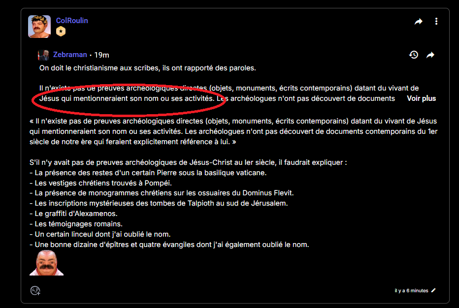 « Pour la mention de Jésus, il faut les documents, les tous premiers, c'est de ça dont je parle, ton cerveau a du mal... »