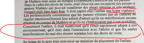 "Concernant l'enfant, il était mentionné qu'il s'était rapidement adapté à son environnement, qu'il était dans l'interaction avec l'adulte et que les seules manifestations de mal-être étaient repérées lors des droits de visite"
