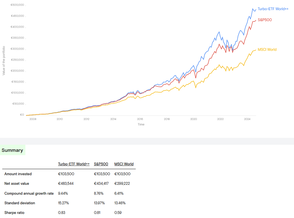 (back test réalisé avec un DCA de 500€/mois couvrant la période de juillet 2007 à septembre 2024)