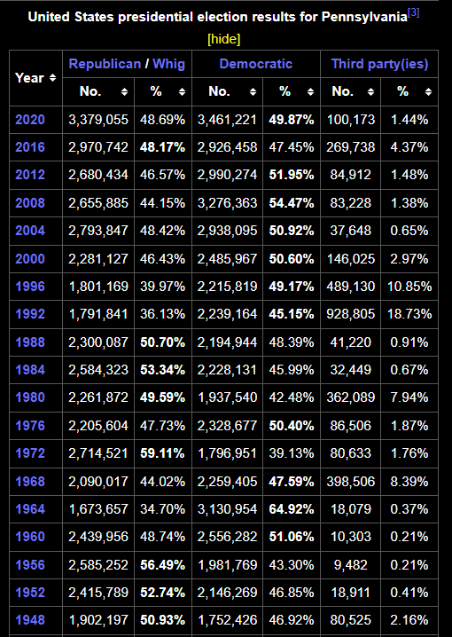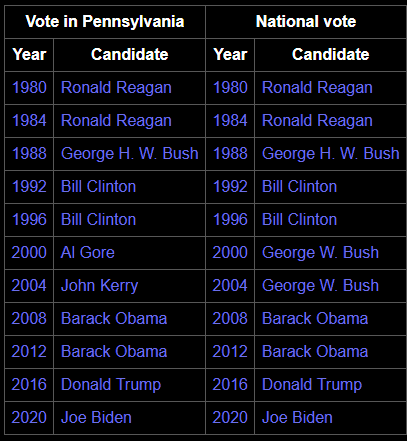 Vous trouverez ci-dessous un tableau des onze dernières élections présidentielles en Pennsylvanie, ainsi que les résultats du collège électoral national. Au niveau présidentiel, l'État a été considéré comme un État pivot tout au long de son histoire, car il n'a voté pour le perdant national qu'à 10 reprises (1824, 1884, 1892, 1912, 1916, 1932, 1948, 1968, 2000 et 2004).