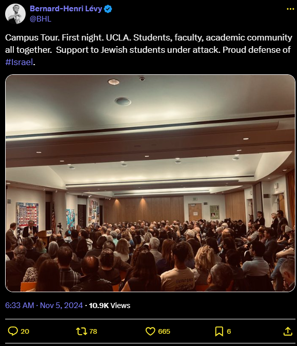 Hier, foule à l'UCLA. Aujourd’hui, j’enseigne au Pomona College. Le sujet académique était : « Perspectives philosophiques sur l'Holocauste ». Mais mon enseignement incluait Levinas, Sartre, Michel Foucault et pourquoi je loue #Israël, non pas en dépit de mes valeurs libérales, mais à cause d'elles.
