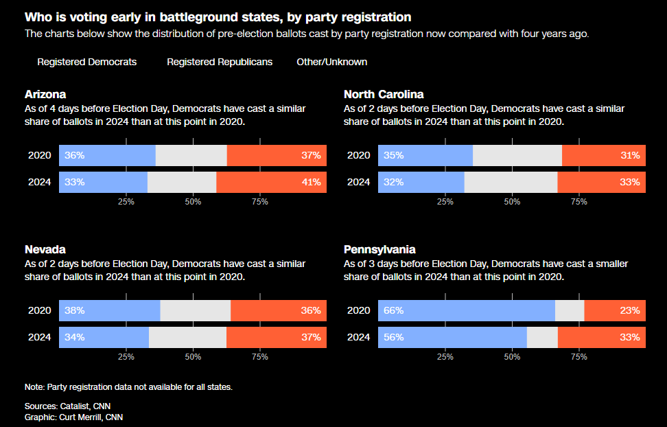 Les électeurs s'inscrivent par parti dans quatre des sept champs de bataille présidentiels et dans chacun de ces quatre, les démocrates ont exprimé une part des votes pré-électoraux cette année plus faible qu'à la même période en 2020. Les données d'inscription par parti ne sont pas disponibles pour les États du champ de bataille de Géorgie, Michigan et Wisconsin.