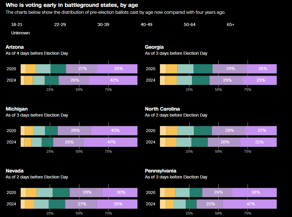 Une autre mesure évidente dans les données jusqu'à présent est que les électeurs plus âgés représentent une part plus importante des personnes votant dans les États du champ de bataille, par rapport à cette période de 2020.