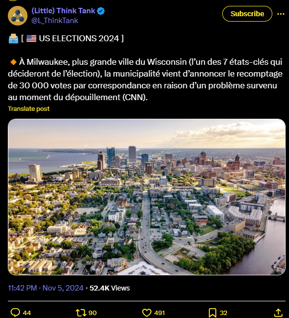🔸À Milwaukee, plus grande ville du Wisconsin (l’un des 7 états-clés qui décideront de l’élection), la municipalité vient d’annoncer le recomptage de 30 000 votes par correspondance en raison d’un problème survenu au moment du dépouillement (CNN).
