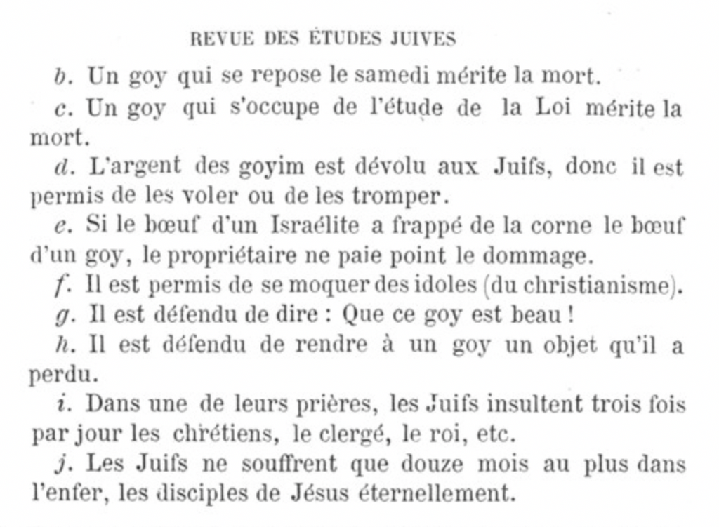 II° «Vous, Juifs, vous êtes appelés hommes, alors que les nations du monde ne méritent pas le nom d'hommes, mais de bestiaux». «La semence d'un goy (non-Juif) est comme la semence d'un animal.» «Le meilleur parmi les goyim, tu dois le tuer». «Fais-le mourir en lui serrant les mâchoires pour qu'il ne crie pas». «Qu'est-ce qu'une prostituée? Toute femme qui n'est pas juive.» Et ainsi de suite. Les expressions contenues dans une prière, que tout Juif orthodoxe devait réciter journellement, dans le Shemoné Esré, sont : «Que les apostats perdent tout espoir, que les Nazaréens et les chrétiens périssent sous les coups, qu'ils soient rayés du livre de la vie et ne . soient pas comptés parmi les justes»