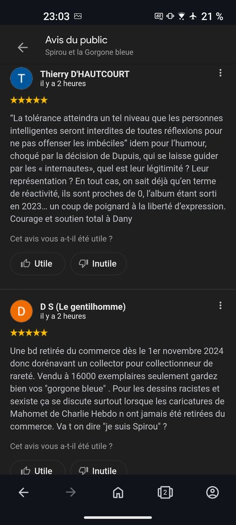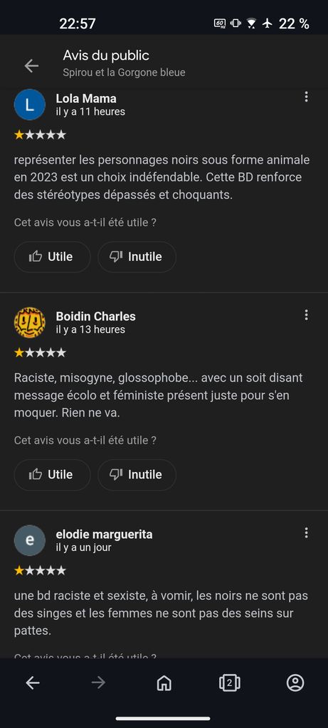 « Depuis quelques jours, les prises de parole se multiplient pour exprimer la colère ressentie devant la représentation des personnes noires et des femmes dans le Spirou vu par Dany et Yann : La Gorgone bleue publié en septembre 2023 », écrit-elle. « Nous sommes profondément désolés si cet album a pu choquer et blesser. Cet album s'inscrit dans un style de représentation caricatural hérité d'une autre époque », explique Dupuis.