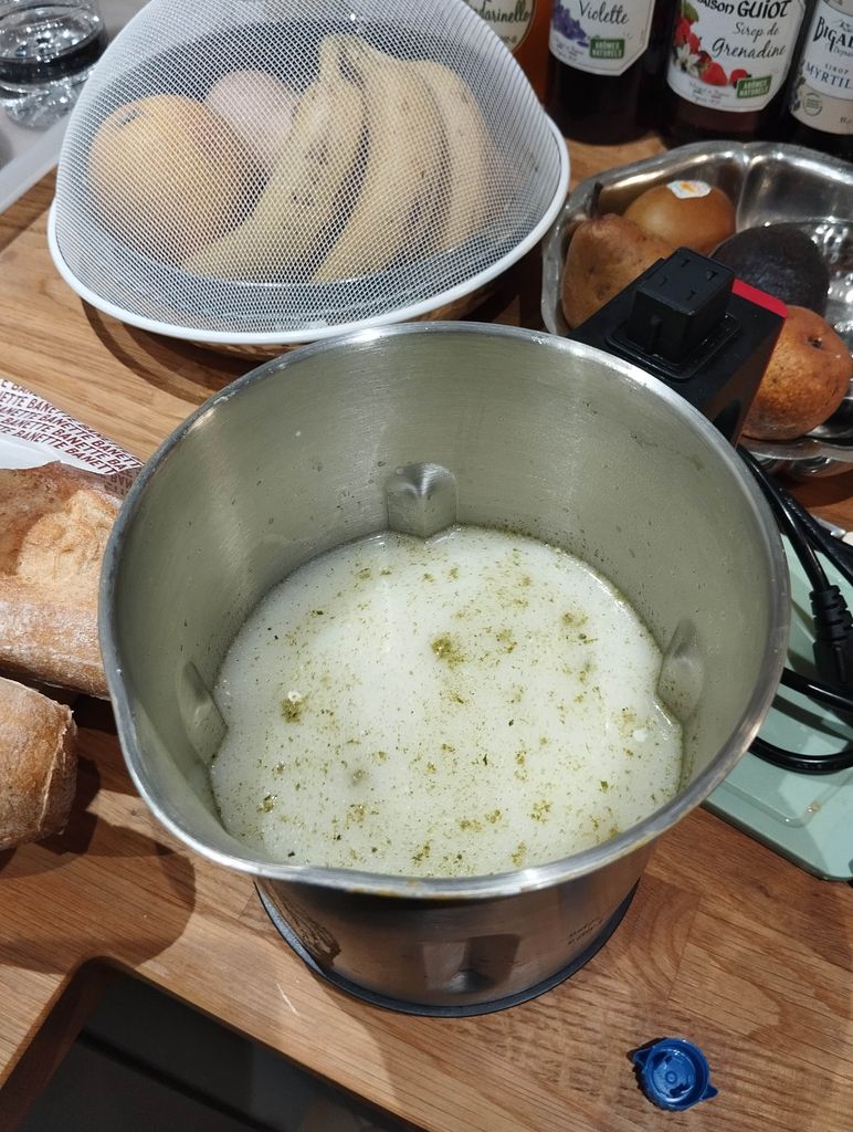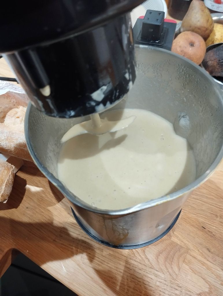 Je met dans mon blendeur chauffant 20 cl de crème, cube bouillon, poivre et le mélange de ma poêle + 60 cl d'eau environ
