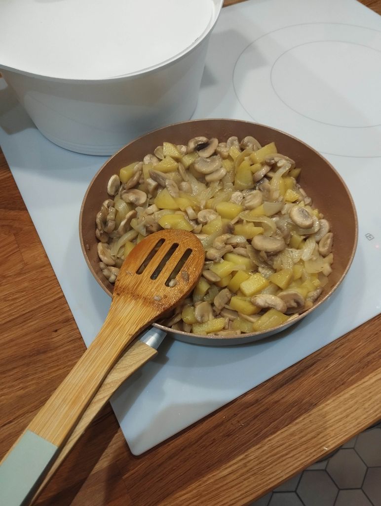 Je fais revenir dans 4 cuillère à soupe d'huile d'olive quelques minutes l'oignon puis je fais revenir à feu moyen/fort les champignons et les patates