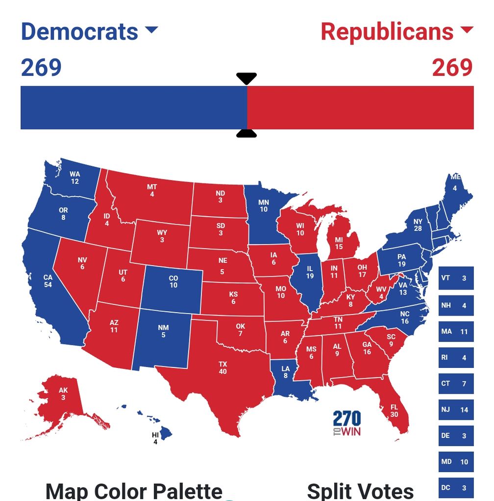 Dans les faits tu as raison, mais elle va être quelque peu "aidée" dans le milieu de la nuit et le lendemain, pour trouver les voix qui lui manquent en Pennsylvanie Michigan Wisconsin, et battre Trump de quelques milliers de voix.