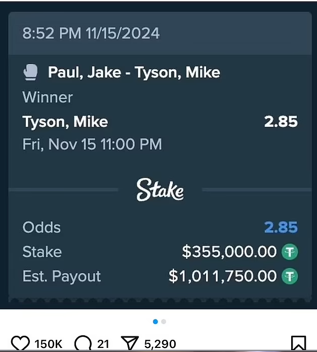 Drake a posté son pari en ligne, montrant qu'il avait choisi Tyson à +185 (2,85), ce qui signifie qu'il peut gagner 1 011 750 $ (802 116 £) avec son pari - un bénéfice de 656 750 $ (520 672 £).