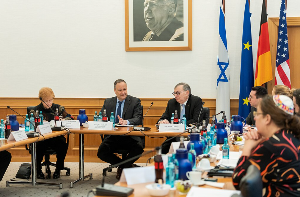 Emhoff (deuxième à partir de la gauche) participe à une table ronde interconfessionnelle au Conseil central des Juifs d'Allemagne, à Berlin, le 31 janvier 2023.