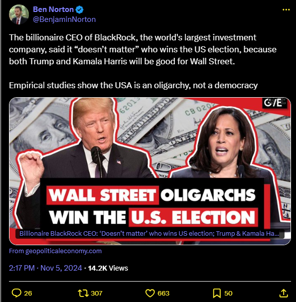 Le PDG milliardaire de BlackRock, la plus grande société d'investissement au monde, a déclaré que peu importe qui remportera les élections américaines, car Trump et Kamala Harris seront tous deux bons pour Wall Street.