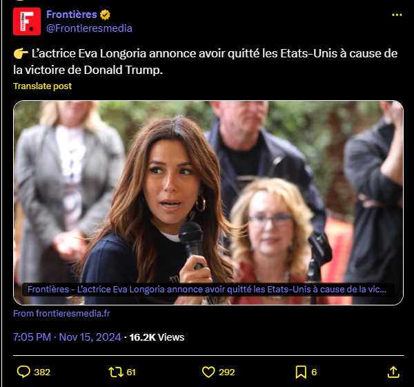 👉 L’actrice Eva Longoria annonce avoir quitté les Etats-Unis à cause de la victoire de Donald Trump.