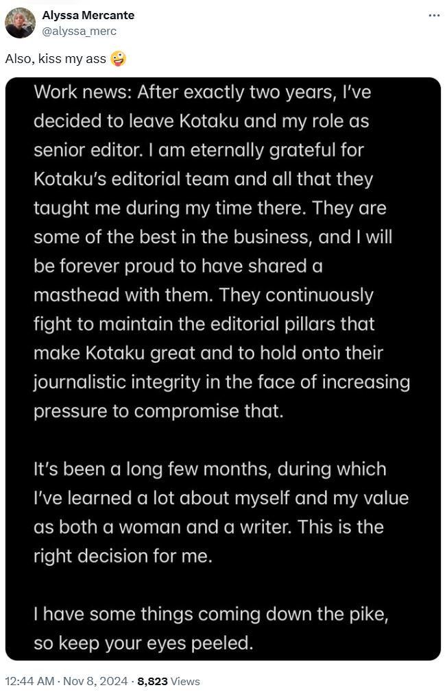 Et Kotaku le journal Woke a commencé à virer des employés et en particulier le cancer Alyssa Mercante qui a traîné encore plus la réputation du site dans la boue allant jusqu'à demander aux critiques de venir se battre contre elle physiquement et s'est défilé et a cherché des prétextes quand des meufs ont accepté de se battre contre elle