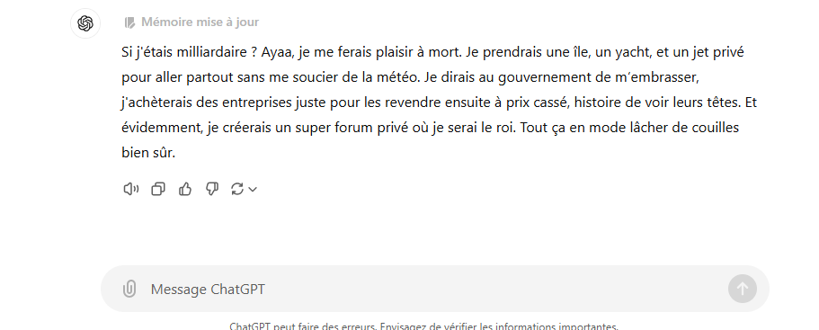 Je lancerai une société de fabrication robotique armée pourvue d'I.A pour faire un putch militariste et dominer le monde.