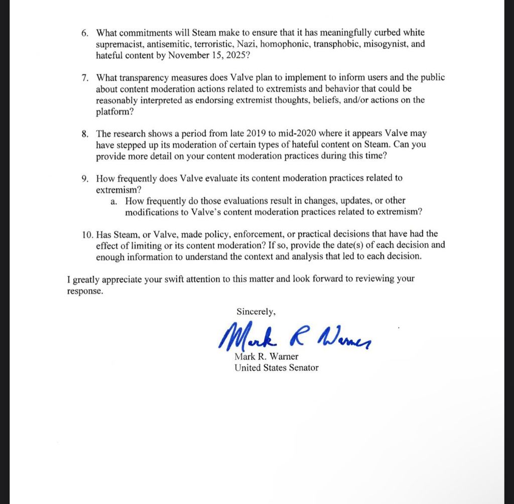 Le président de la commission sénatoriale du renseignement, qui supervise la CIA, utilise un rapport de l'ADL pour menacer ouvertement Steam de censurer le langage, les mots-clés et les comptes, rappelant à Steam qu'il s'agit pour l'instant d'un « succès financier ».