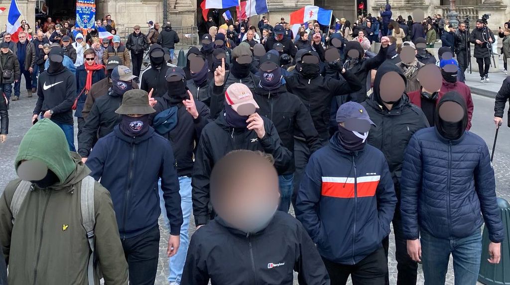 Vingt minutes plus tard, nous avons été interpellé-es par des cris provenant du haut de la rue Saint Hippolyte. Un premier groupe d'individus, plus tard identifié comme appartenant au GUD (Groupe Union Défense) qui se cache sous le nom de WAFFEN, se trouvait à ce moment-là au croisement de cette rue et de la rue de la Glacière, proche du campus René Cassin, tandis qu'un second groupe se tenait proche de l'entrée du campus de Lourcine.