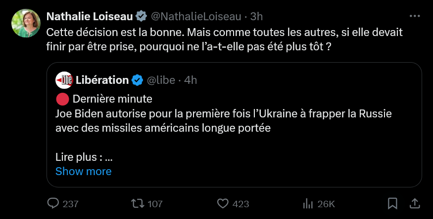 Oui, c'est tellement énorme que je n' y ai pas cru. Depuis j'ai vu Poutine annoncer que ces missiles longue portée sont obligatoirement pilotés par satellite, que l'Ukraine n'a pas de satellite, que ça implique un pilotage par L'OTAN et que du coup l'ennemi devient l'OTAN. Chaud
