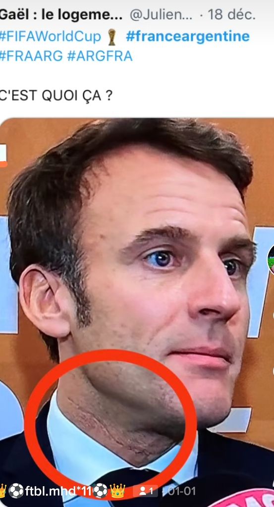 Dans une épisode des Simpsons les extraterrestres ont bricolé un plans qui consiste à couper les têtes des dirigeants est les placé sur des corps (avec de l'électronique dedans) , personne ne remarque quelque chose sauf une cicatrice comme seule de Macron