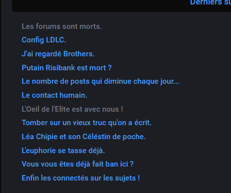 Le forum me manquera, ainsi que de nombreux kheys, mais les Débilax5000 dans votre genre ça me fera du bien de plus les croiser.