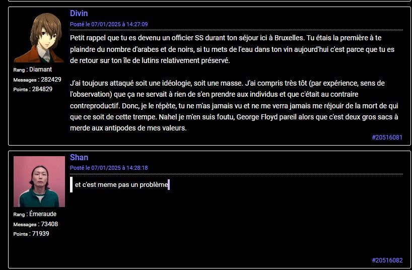 J'ai toujours attaqué soit une idéologie, soit une masse. J'ai compris très tôt (par expérience, sens de l'observation) que ça ne servait à rien de s'en prendre aux individus et que c'était au contraire contreproductif. Donc, je le répète, tu ne m'as jamais vu et ne me verra jamais me réjouir de la mort de qui que ce soit de cette trempe. Nahel je m'en suis foutu, George Floyd pareil alors que c'est deux gros sacs à merde aux antipodes de mes valeurs.