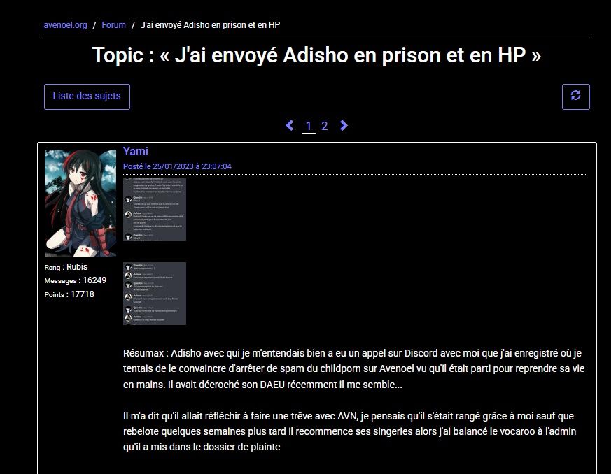 Résumax : Adisho avec qui je m'entendais bien a eu un appel sur Discord avec moi que j'ai enregistré où je tentais de le convaincre d'arrêter de spam du childporn sur Avenoel vu qu'il était parti pour reprendre sa vie en mains. Il avait décroché son DAEU récemment il me semble...