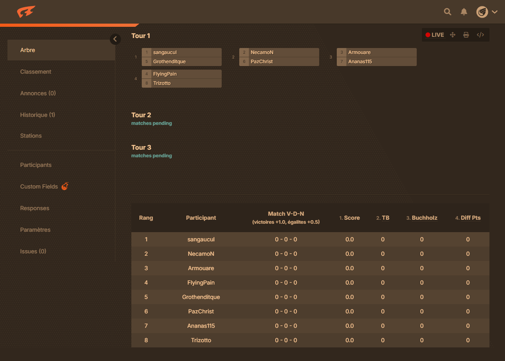 Comme l'a suggéré sangaucul on va le faire à la suisse, couramment utilisé dans les tournois d'échecs pro
