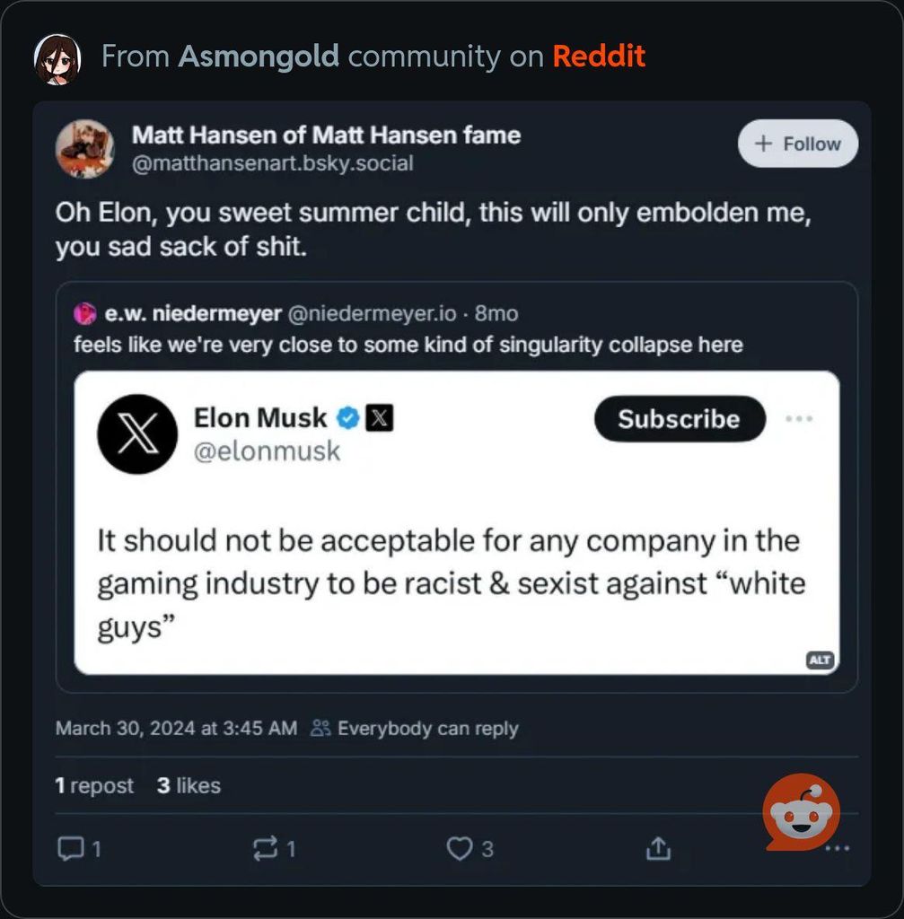 Apparemment, le "Art Daddy" a une profonde haine envers son ennemi juré Elon Musk qu'il a décidé de mettre des pronoms dans le jeu uniquement pour faire réagir Musk