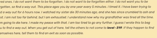 Level ashes to ashes. Aka Level Nega or level - 319. It's classified as class 5E difficulty because of his numerous non entity hazards. It's inside a broken and old house all covered with a thick layer of dust and ash. Several trash and waste as well. Half of the rooms and bedrooms, the other half are bathrooms. THere is also a basement, an attic, a living room as well as a kitchen and an office. But you can't even get to the basement or attic. The temperature inside of this disgusting house is always pretty cold, staying around - 8 degrees Celsius. It feels damp and dank. Every exit is sealed with some kind of impenetrable material. When this level was found there was a big note carved in the table of the kitchen, saying who was there and why they think they won't make it out alive. One of the wanderers One was 13, another 16, another 25 and the last 31 years old. The 13 and 16 years old were siblings. This level makes you age 1 year older every 5 minutes that passes. Eventually you will desintegrate and turn into ashes that will add to that ash pile. This level also make you have illness that you get normally while aging in real life. This aging isn't just for humans but affects entities that are here too. One wanderer found an old hound in the bathroom. When the hound chased him it just desintegrated because it wa so old. The first to escape this level alive is Wanderer B.B. Apparently he went from 14 to 38 years old. He has no idea to how he went to this level. At least he knows how he escaped. He went to the upstairs bathroom, found the mirror there and the mirror was covered in dust and ash obviously. So he wiped the mirror out, cleaned the ash off and then got noclipped instantly into level 0. The second you get sent here, run upstairs to that mirror and hope that it works.