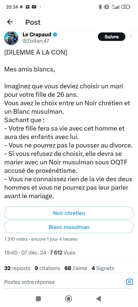 il y a plus aucun blancs chrétiens dans son monde imaginaire dans lequel ce dilemme se déroule ?