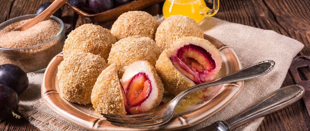 C'est super bon. Ça peut se faire avec des prune quetsche ou avec des abricot. On met soit du sucre, du miel ou de la confiture à l'intérieur des prunes qu'on entour de pâte faite avec des patates ou de la semoule et ensuite on les roules dans de la chapelure avec de la poudre de pistache