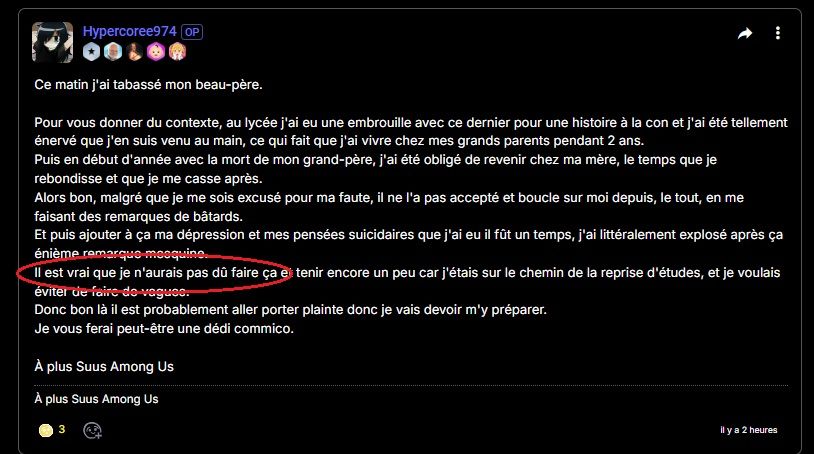 ma parole t'es un homme gros ta bien fait d'l'enclencher les beaux pères c'est tous des sales merdes il est personne pour te dire cque ta a faire après je sais qu'ça fait mal de devoir te faire confronter par ta daronne mais tu restes son fils et donc sa priorité