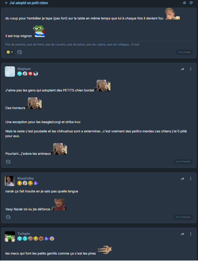 Je te demande de démontrer en quoi il t'a harcelé pour mériter que vous veniez insulter son chien à plusieurs sur un topic inactif depuis 2 mois.