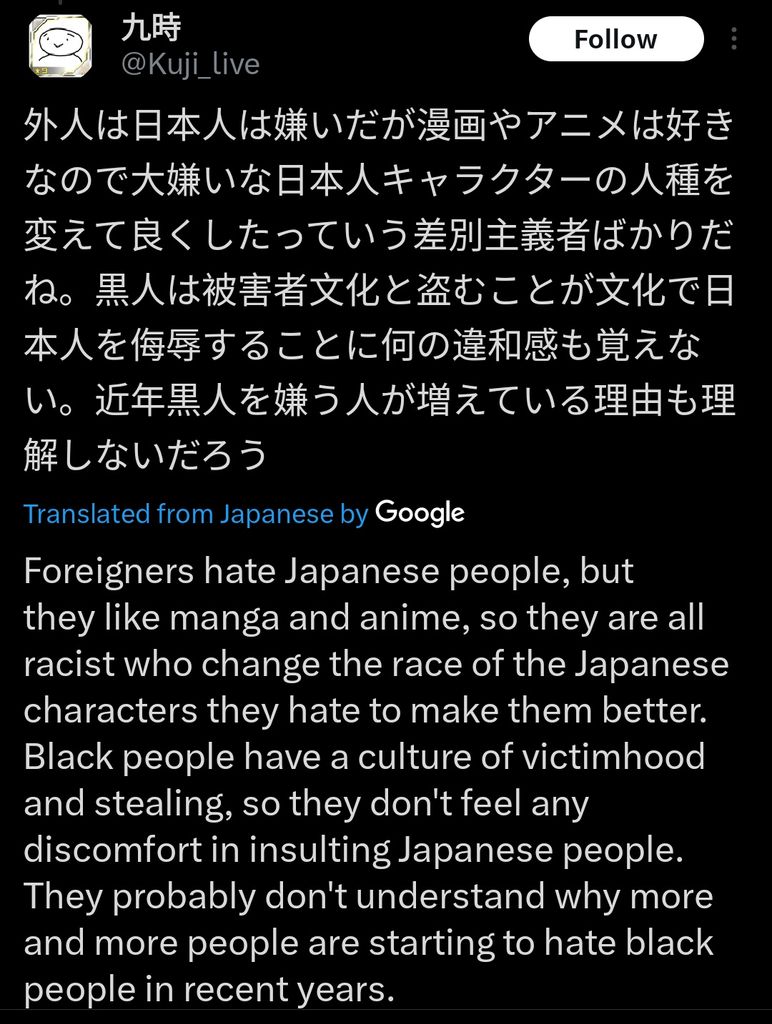 Et y a aussi un voice actor noir américain qui travaille sur un anime Dadadan je crois bref, il a changé son avatar twitter pour un perso blackwashé, maintenant les japonais réclament qu'il se fasse virer