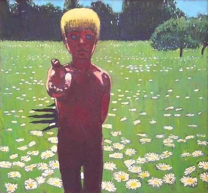 Et plus on la regarde, plus on comprends pourquoi on a cette gene. Peu etre les yeux trop grand? Les cheveux si blond? L'absence d'organe sexuel? Le decor a la fois vide mais rempli de fleurs identiques? La main tendu? La griffe dans le dos? Ca fait beaucoup de raisons en fait, il faut rester un moment sur l'image pour comprendre le malaise.
