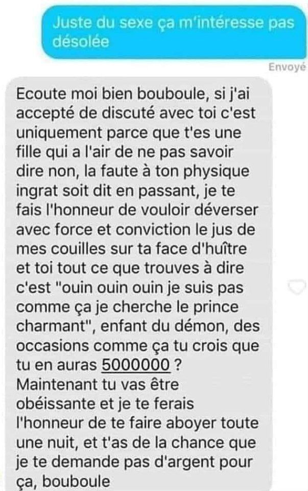 Baise à la pelle mais envoie encore des messages malaisants comme un puceau de 17 ans