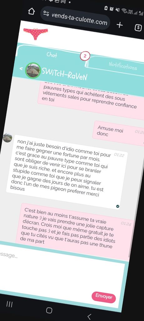 Quitte à attaquer des gens, autant attaquer ceux qui le méritent, un site de femmes méprisante qui veulent réduire l’homme à rien en le rendant indigne, lui faire contenter du virtuel et en lui vendant des déjections, des culottés sales, des chaussettes sales, en l’exploitant de la manière la plus méprisante possible. En m’inscrivant sur le site, j’ai juste vu des boudins qui agressent la rétine des yeux
