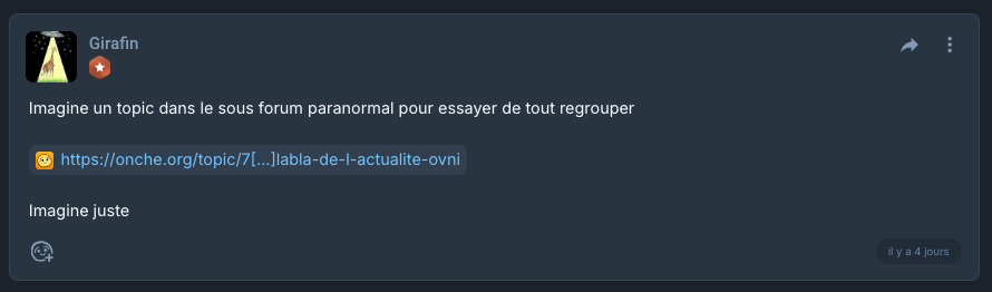 Pas comprendre la différence entre un topic de suivi dans paranormal consultable et un topic informationnel éphémère du général qui sera perdu dans 2h.