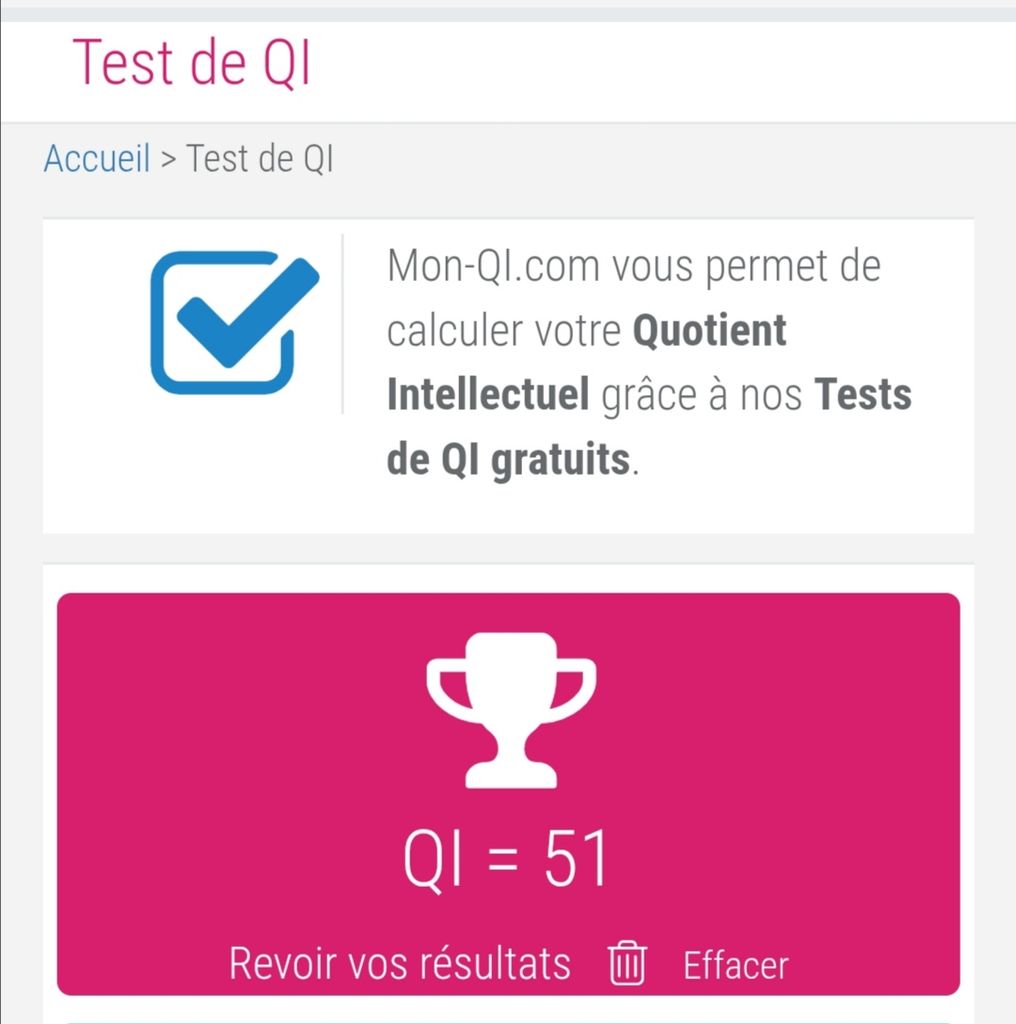C'est pas fiable les tests en ligne gratuits, j'avais meme fait un payant à 5 balles j'avais eu 127 et en réel avec un psychologue j'avais eu 121. J'en ai refait un l'an dernier mais la meuf a pas voulu donner un resultat parce que y'avait trop d'ecart partout a cause de mon TDAH qui a beaucoup baissé certains resultats