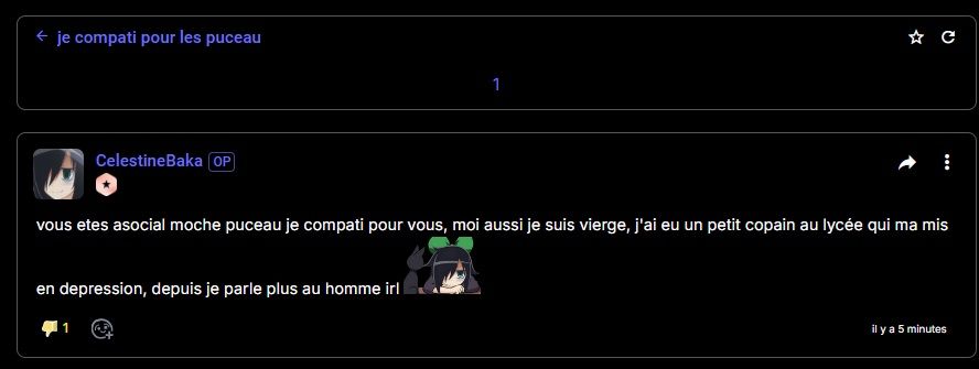 l'hygiène de merde que vous devez avoir les femmes, clairement vous êtes au moins aussi sale que les hommes, c'est pour ça qu'on préfère être seul en définitive