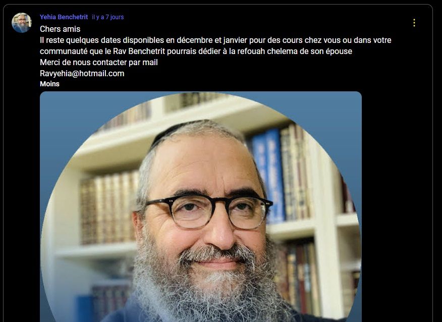 Il reste quelques dates disponibles en décembre et janvier pour des cours chez vous ou dans votre communauté que le Rav Benchetrit pourrait dédier à la refouah chelema de son épouse