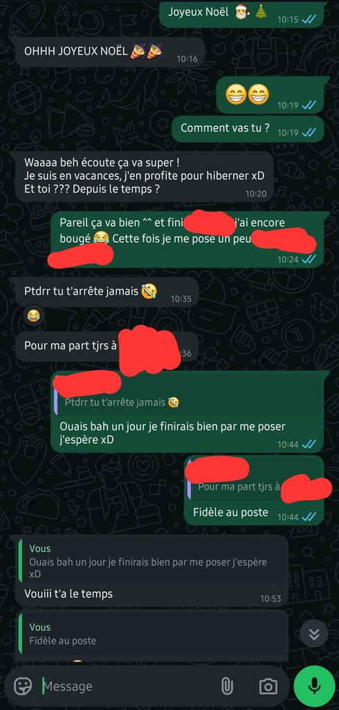 Je lui envoie joyeux noel elle me répond avec un enthousiasme démesuré