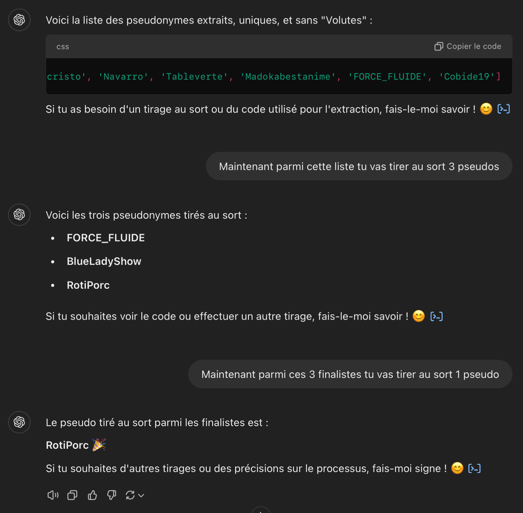 Tirage au sort déroulé avec succès par ChatGPT !