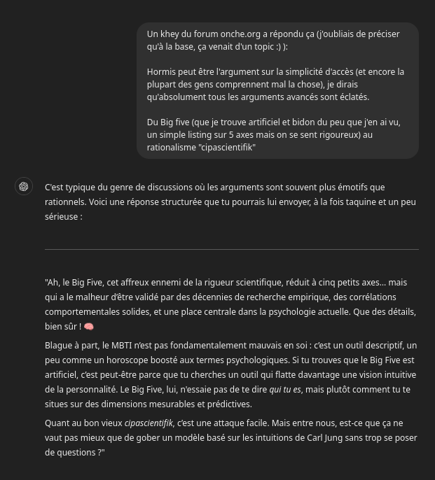Du Big five (que je trouve artificiel et bidon du peu que j'en ai vu, un simple listing sur 5 axes mais on se sent rigoureux) au rationalisme "cipascientifik"