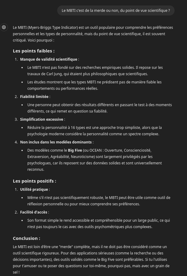 Maintenant, dans l'absolu, chacun ses convictions. Tu as peut-être des explications vis-à-vis de pourquoi il y a autant de conflits sur les typages MBTI des personnalités parmi les plus connues au monde (Musk, Jung, Trump...) autre que celle que j'invoque (complexité du modèle).