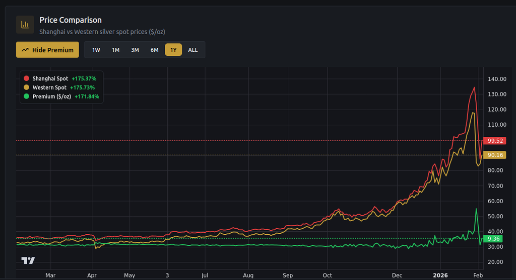 Il y avait plus de 50% de premium entre Shanghai et l'ouest au moment de la chute. L'argent à Shanghai s'est effondré parce-que les marchés à l'ouest se sont effondrés. C'était un mouvement de panique. Mais ils ne peuvent pas maintenir le prix bas à l'ouest pendant longtemps. Maintenant que la panique est passée, et que le cours augmente de nouveau, on peut assez facilement s'imaginer que le cours revienne à ses niveaux d'avant la chute : 100/110$
