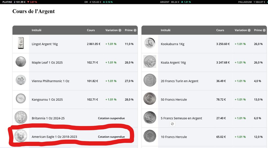 Cotation suspendue chez mon Vendeur/Acheteur pour l'American Eagle